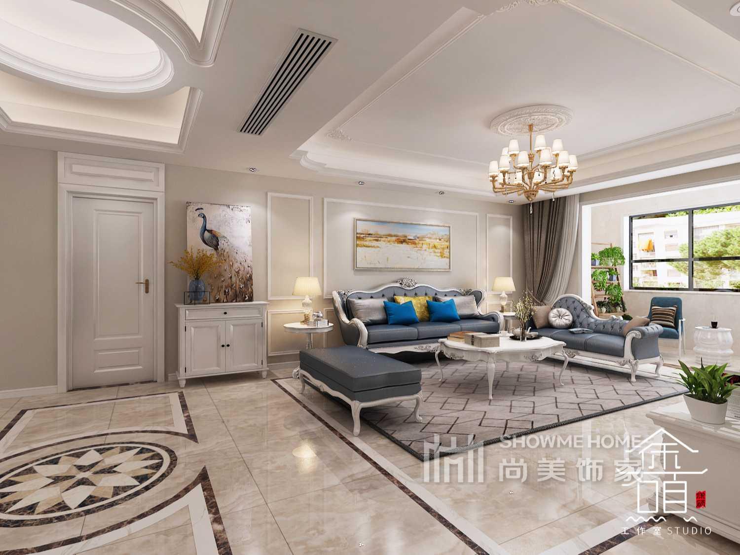 3.客廳效果圖及設(shè)計(jì)說明:公共空間以開放式格局表現(xiàn)大氣與奢華,淡米色的乳膠漆與藍(lán)色花紋墻紙結(jié)合,溫潤(rùn)有質(zhì)感??蛷d是交際暢談的空間,是優(yōu)游自在所處,沒有太過于夸張的造型與色彩,簡(jiǎn)單而有細(xì)節(jié)的石膏線條硬裝,使整體空間簡(jiǎn)潔明亮,恰到好處,用不同的視角,解鎖不同的情感表達(dá)。