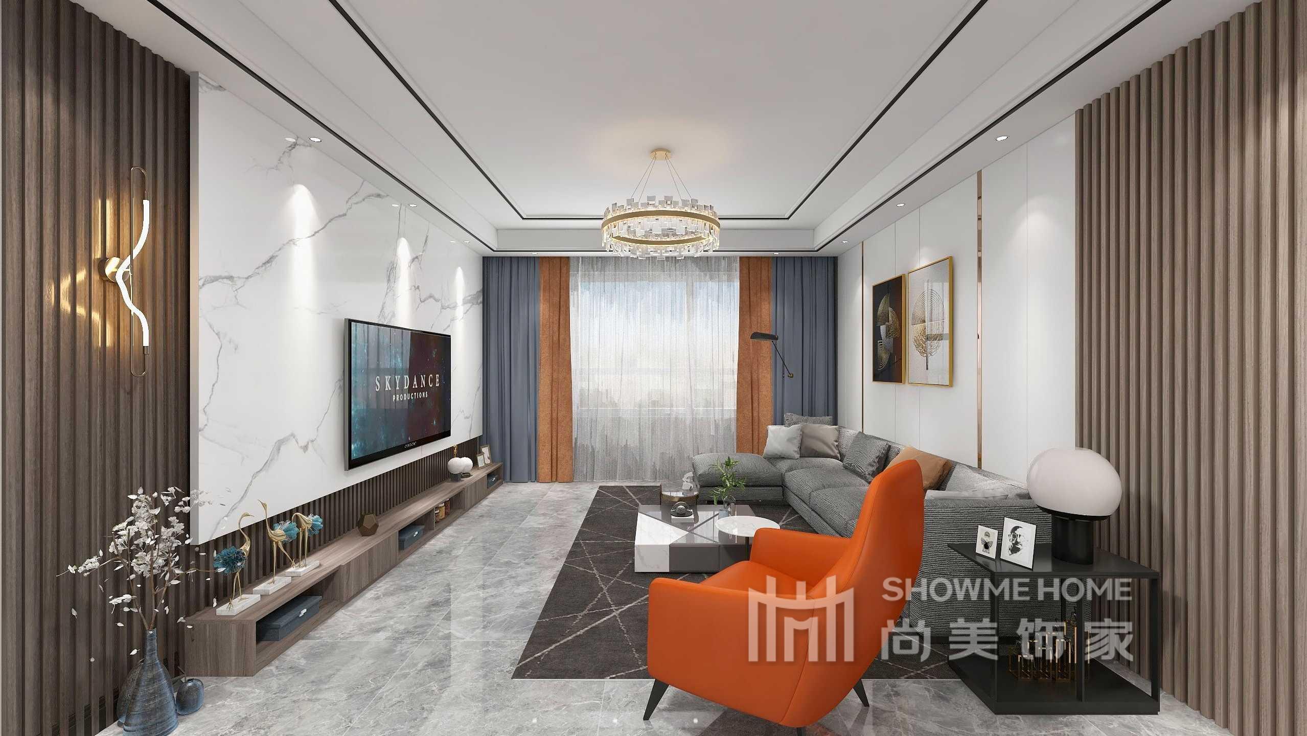 客廳影視墻用大理石造型結(jié)合。沙發(fā)背景墻用實(shí)木線條和壁布。